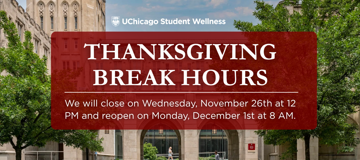Student Wellness will close early on Wednesday, November 26th at 12:00PM and remain closed all day on Thursday, November 27 and Friday, November 28 due to the Thanksgiving holiday.