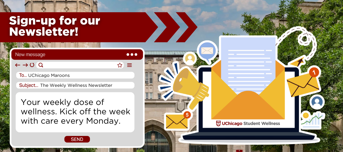 Looking for easy wellness tips, campus updates, and a tiny moment of calm in your inbox? The Weekly Wellness Newsletter is your one-stop shop for everything happening at the University of Chicago Student Wellness Center.