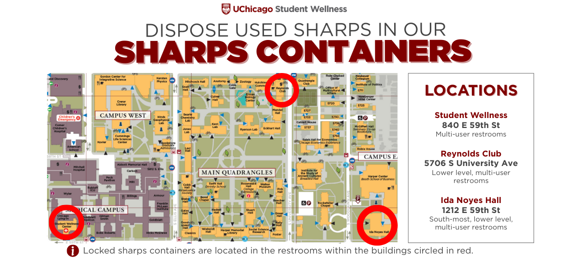 Locked sharps containers are located in the Student Wellness Center, Reynold's Club, and Ida Noyes Hall to dispose of used needles safely.